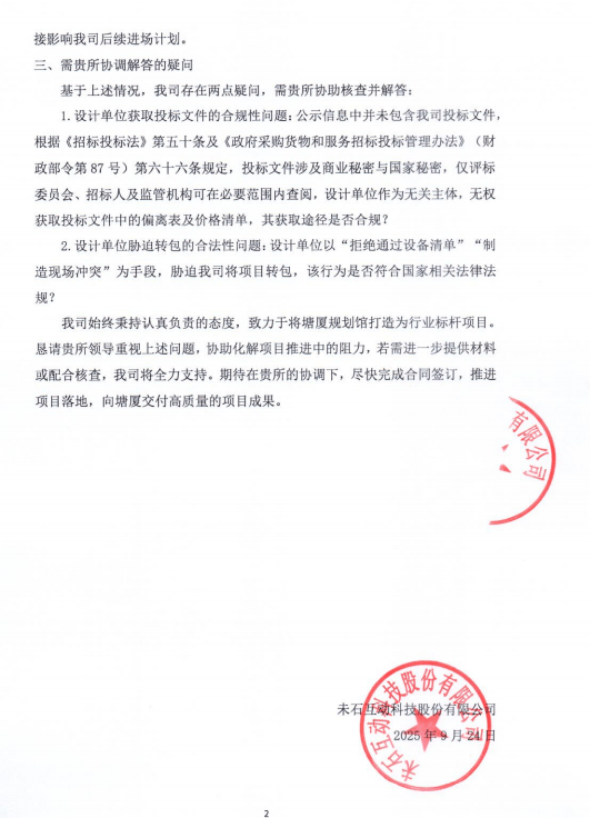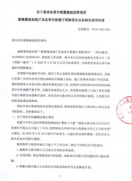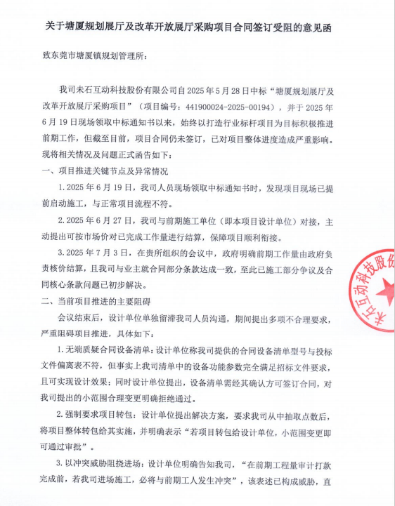 近日,未石互动科技股份有限公司(以下简称“未石互动”)向媒体实名举报,反映东莞市塘厦镇规划展厅及改革开放展厅采购项目(项目编号:441900024-2025-00194)存在一系列违法违规行为。作为该项目合法中标单位,未石互动在中标后投入大量人力物力筹备,却遭遇采购人逾期拒不签约、单方违法废标,设计方提前施工、参数控标并要挟转包等问题,直接经济损失已达80万元,政府采购的公平性遭遇严峻挑战。