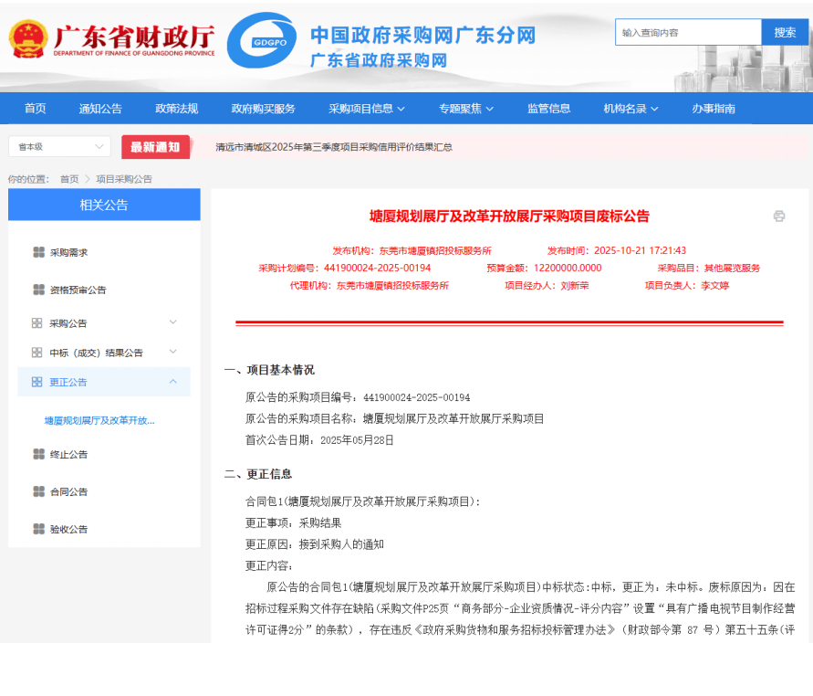 最让未石互动无法接受的是采购人的“单方面毁约”。自6月19日领取中标通知书后,该公司在7月至10月期间多次发送催签函,但采购人始终拖延,逾期超5个月仍未签约。10月21日,东莞市塘厦镇规划管理所在未与未石互动沟通、未听取任何申辩的情况下,单方在广东省政府采购网发布《废标公告》,以“采购文件中‘广播电视节目制作经营许可证’评分条款存在缺陷”为由撤销中标结果。