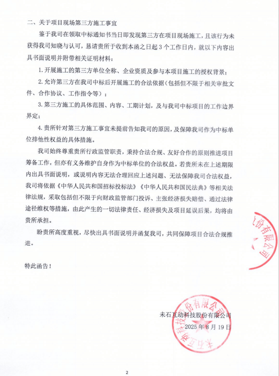 未石互动指出,依据《中华人民共和国政府采购法》第三十六条,废标仅适用于“中标前符合专业条件供应商不足三家、存在影响公正的违法违规行为、报价超预算、采购任务取消”四种情形,本案均不涉及;且该法第四十六条明确“中标通知书发出后,采购人改变中标结果应承担法律责任”,采购人的废标行为无任何事实及法律依据。