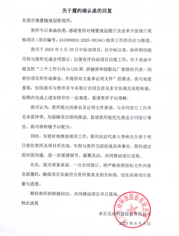“中标后我们立刻组建专项团队,完成方案深化设计、开展物料采购询价、调配施工班组,全力筹备履约事宜。”未石互动负责人表示,公司始终以打造行业标杆项目为目标,累计投入的人员薪酬、设计咨询、差旅交通、法律咨询等直接成本已达80万元。然而,令人意外的是,采购人东莞市塘厦镇规划管理所以“采购清单有缺陷”等为由,迟迟不启动签约流程,履约之路从一开始就陷入停滞。