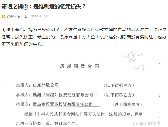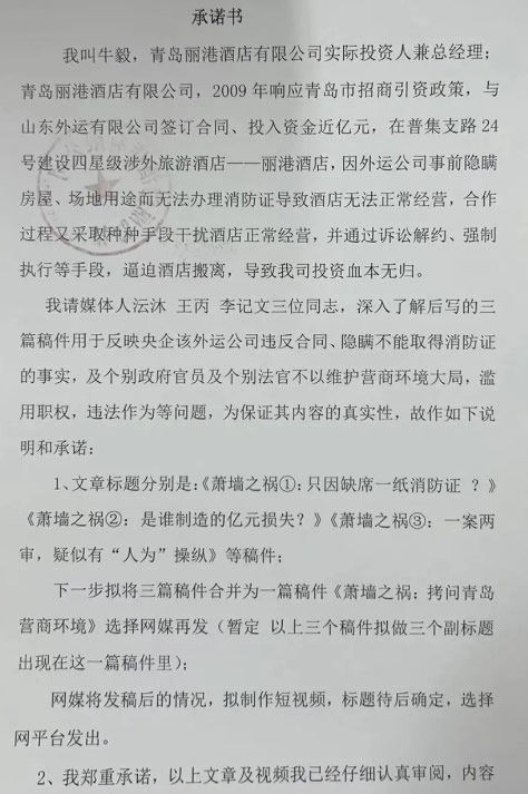 乙方牛毅是被当地政府和央企山东外运公司招商引资而来的,招商时,如沐春风;等到巨资投入后,知道你走不了了,却百般使坏。十几年前,我们经常看到类似于此的投资商悲惨遭遇的报道,称招商引资是“笑脸相迎”,当客商把资金投进来后,就上演“关门打狗”,翻脸了;之前表态的、签字的协议统统打折扣或干脆不算数了。放眼全国来来,现在这些问题相对少多了。从中央到地方都在下势治理营商环境,青岛市也陆续出台了一系列优化营商环境的政策文件。我们看到青岛市的营商环境确实一天比一天好。也许,乙方牛毅合作的不是一般青岛地方可以管得了的企业,而是央企;这只是一个例外罢了。但是,我们坚信,在中国没有法外之地,不论你是地方管的一般企业,还是国企,抑或央企,在法治下的中国,永远是法律面前人人平等!我们坚信,不远千里从西部边陲甘肃来青岛投资的乙方牛毅会很快迎来曙光和转机的!敬请关注后续 萧墙之祸③(沄沐 王丙 李记文)